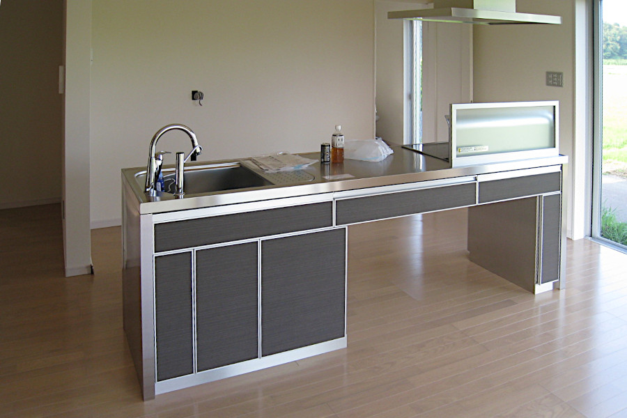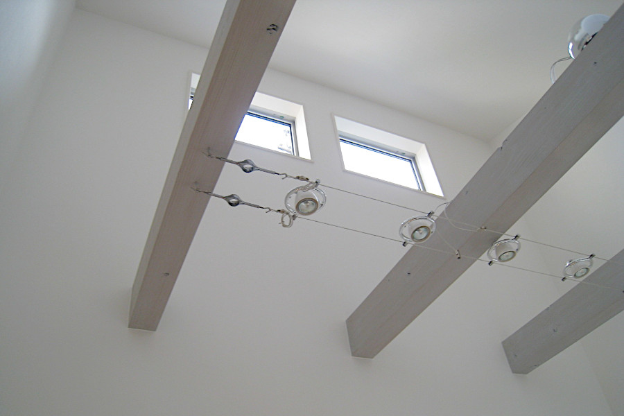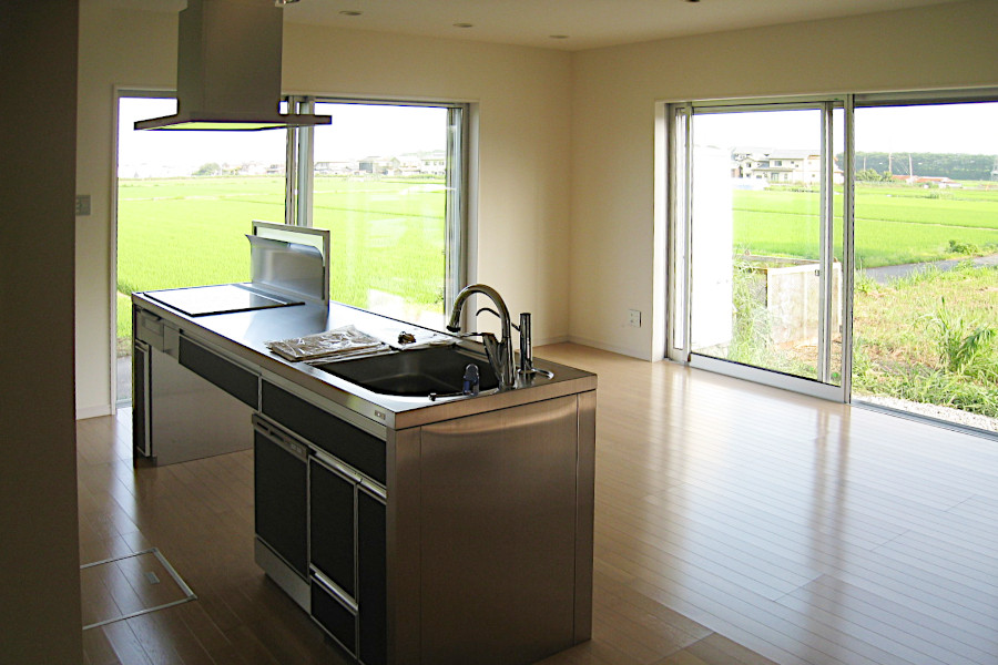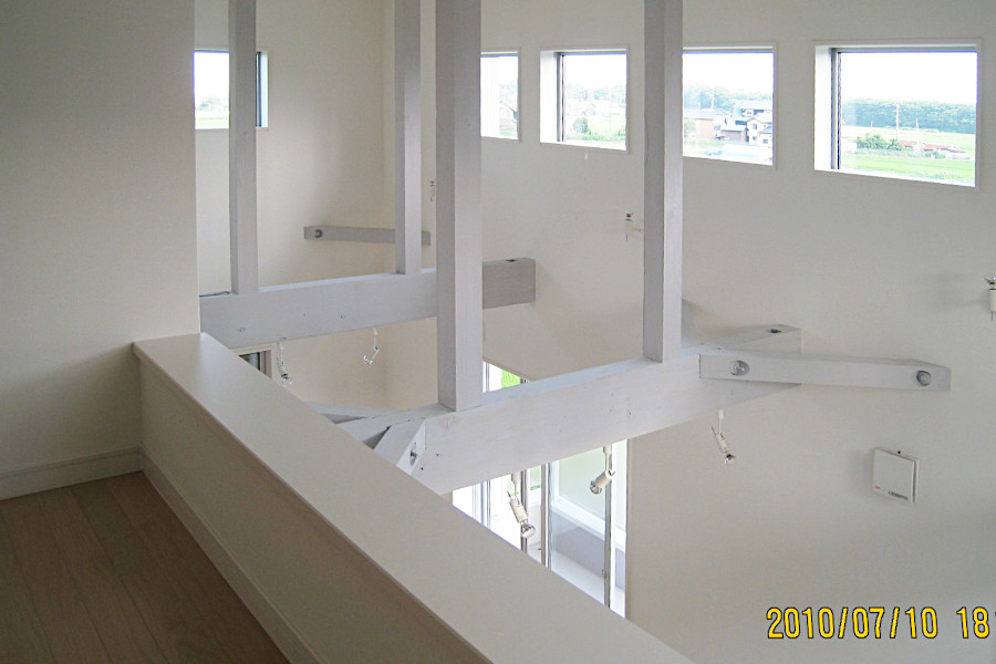 白い梁のホワイト・リビング 窓の向こうの田園風景が映える、 全面ホワイトの内装。 印象的な吹き抜けと白い梁。 無機質なメタリックキッチンが 空間のアクセントに。 差し込む光を反射し、拡散し、 室内を明るく彩ります。 施工実績【新築】TOPへ