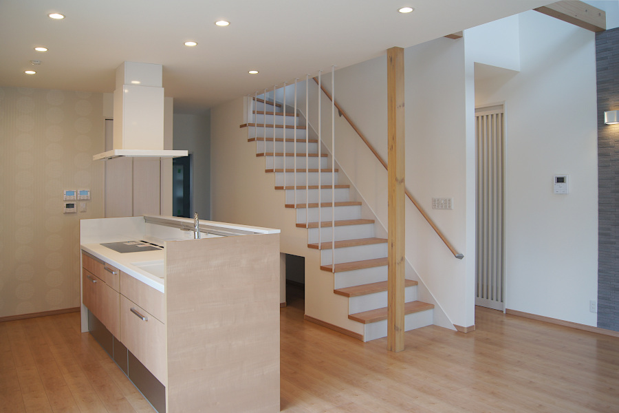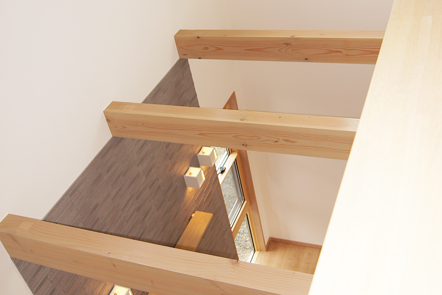 吹き抜けリビング“陽だまり”の家 吹き抜けを見上げると、 空間を横切る大梁。 ハイサイドライトから差し込む光。 二方向の大開口で外部とつながる、 明るく開放的な 陽だまりリビング。 施工実績【新築】TOPへ